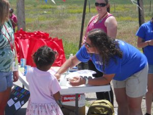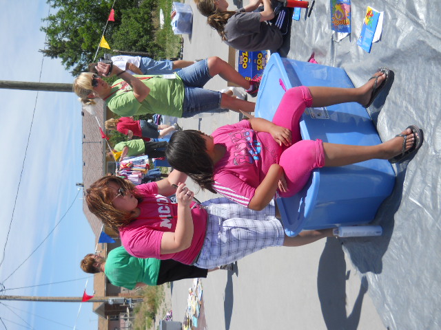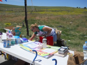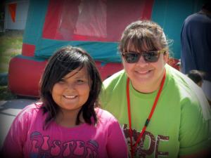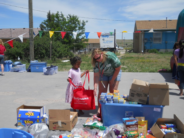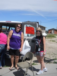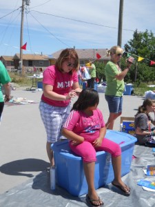 We went to our last block party today in Wounded Knee Housing with the Wings Like Eagles Block Party Group. It was more of the same from Monday–our efforts were the same focus safety for the kids and cardiovascular screenings for the adults. The party was steady–more kids than adults, yet plenty of clients for us. We had some strollers to give away–an identified need came from observations. Many moms carry their babies in their arms and do not have strollers. We decided to give some strollers away….I noticed a little girl of about 7 or so looking at our strollers. I struck up a conversation with her, and asked her if her family needed a stroller. She said that her name was L., and that she had a brother and sister–one 4 and one 3 and that they are always fighting over the stroller. If we were anywhere else, I would wonder if this little girl had an ulterior motive–maybe wanting a stroller for her baby doll, but her I know that she is looking out for her family. Family is so important-yet in a different way than what I am used to. I am so impressed by this little girl and others that I have seen, who are looking after younger siblings in all that they do. L. took the stroller and seemed to enjoy herself at the block party, taking other supplies (mostly clothes) for her younger siblings. She also got her hair braided by Natalie. We gave away ALL of our children’s supplies–which was absolutely our goal. I will have to do a final tally, but I think we gave away something like 20 carseats, 5 strollers, cases of diapers, hygiene supplies, dental care supplies, etc. Again, the students worked SO hard and were very engaged. Love seeing them in action!!!!!