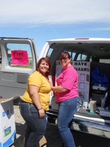 Jessica and Lindsay–prepping to do cholesterol checks out of the van (could not do them in the direct sunlight so they worked out of the van!)