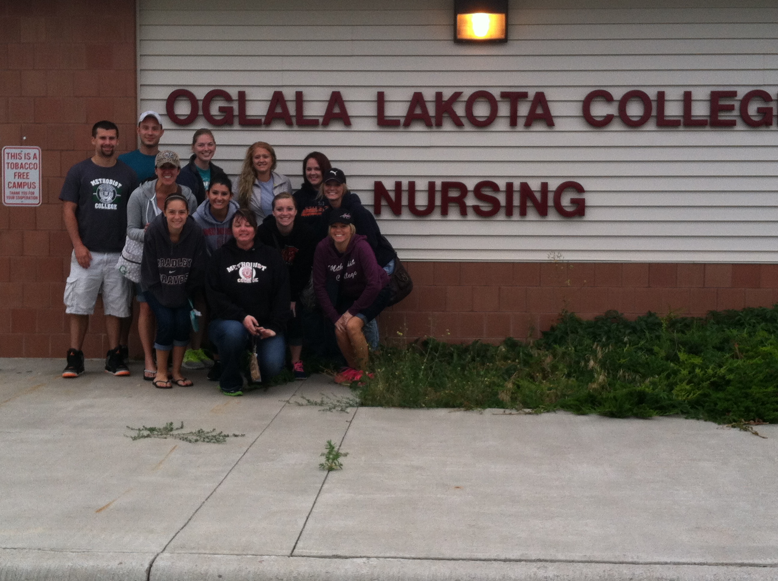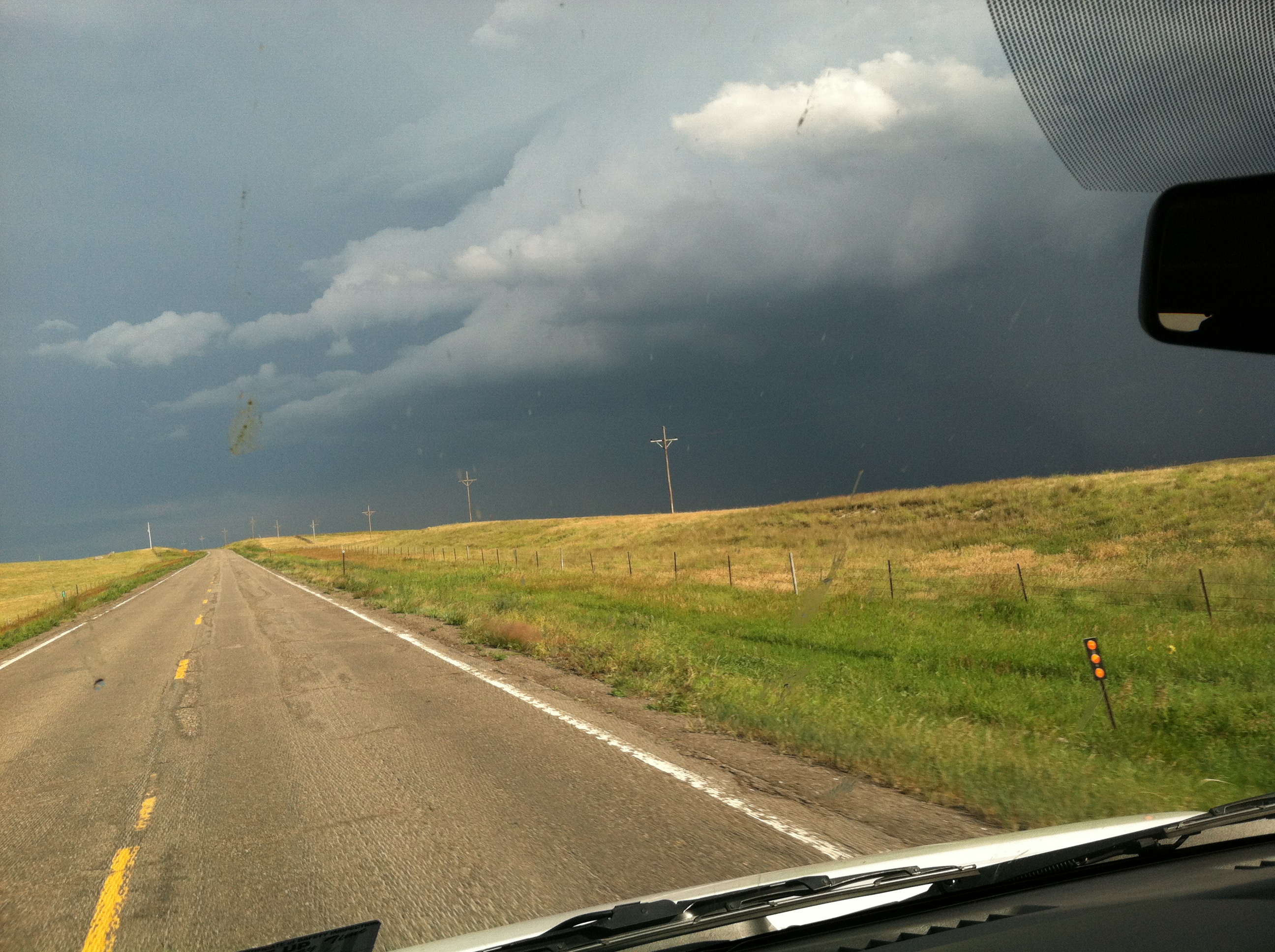 Not even sure where to start with this crazy day! We left Sioux Falls around 9am this morning and made it to the Kyle, SD by 2:30pm. This day’s drive is so much different than the previous day–so much beautiful scenery. After a strained 15 minutes trying to check into the motel in Kyle (strained because I was initially told that there were only 2 cabins reserved for my party of 21! More strain when I realized that the motel could not take my college-issued American Express). Plenty of cabins and a different college credit card later, everyone had a room. We relaxed for a very short time and then hauled to the Walmart in Chadron, Nebraska for supplies and a prescription pick-up for an ill student. The picture posted of the clouds is on our way to Nebraska (a two hour trip). On the way, I thought I saw a tornado–there appeared to be dust swirling under these very ominous clouds. I stopped the van and was just seconds away from having my 14 passengers lie in the ditch, when someone realized that the dust was from a car traveling down a gravel road ahead. OK, I know this sounds like a huge hallucination or delusion on my part, but I am TIRED and I SWEAR it appeared to be a tornado!!!! I know that this will give the students lots to talk about–I am not sure that anyone will want to ride with me after this day! At Walmart, we were able to get many items for our health promotion efforts–car seats, booster seats, baby items, strollers, etc. We received so much more in cash donations than I ever expected. The generosity of past students, current students, family members, friends, etc. is overwhelming. Our student pitched in and worked as a team to get our shopping, loading, unloading, and stowing done. I love to see this, and look forward to seeing them in action out in the community. We have a big day planned for tomorrow so enough for now.