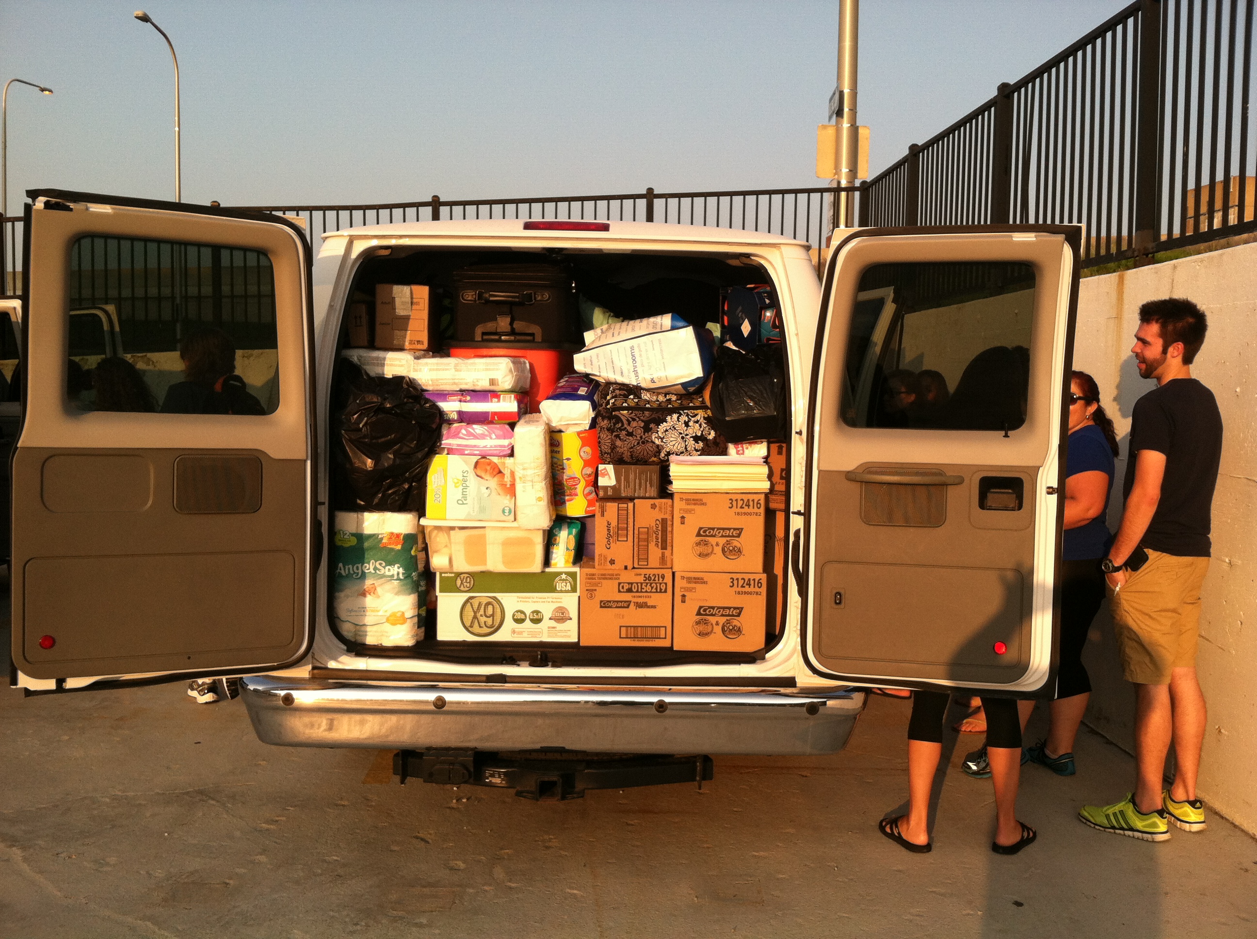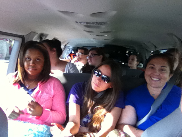 We have made it safe and sound to Sioux Falls with only minor difficulties (carsick student). The group is exuberant and going with the flow so far. Tomorrow I will give the final tally on what students raised in donations–we are having a guessing game for the students to see who is closest to the correct amount of donated cash and gift cards, and the winner will be notified tomorrow (so I can’t share tonight–the amount is astounding though). Here are a couple of photos–group prior to leaving the college; donations in the back of my van; and a random in van photo. Looking forward to finishing the drive tomorrow to Pine Ridge.