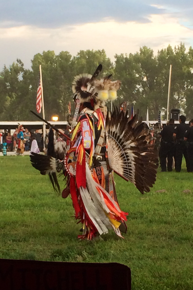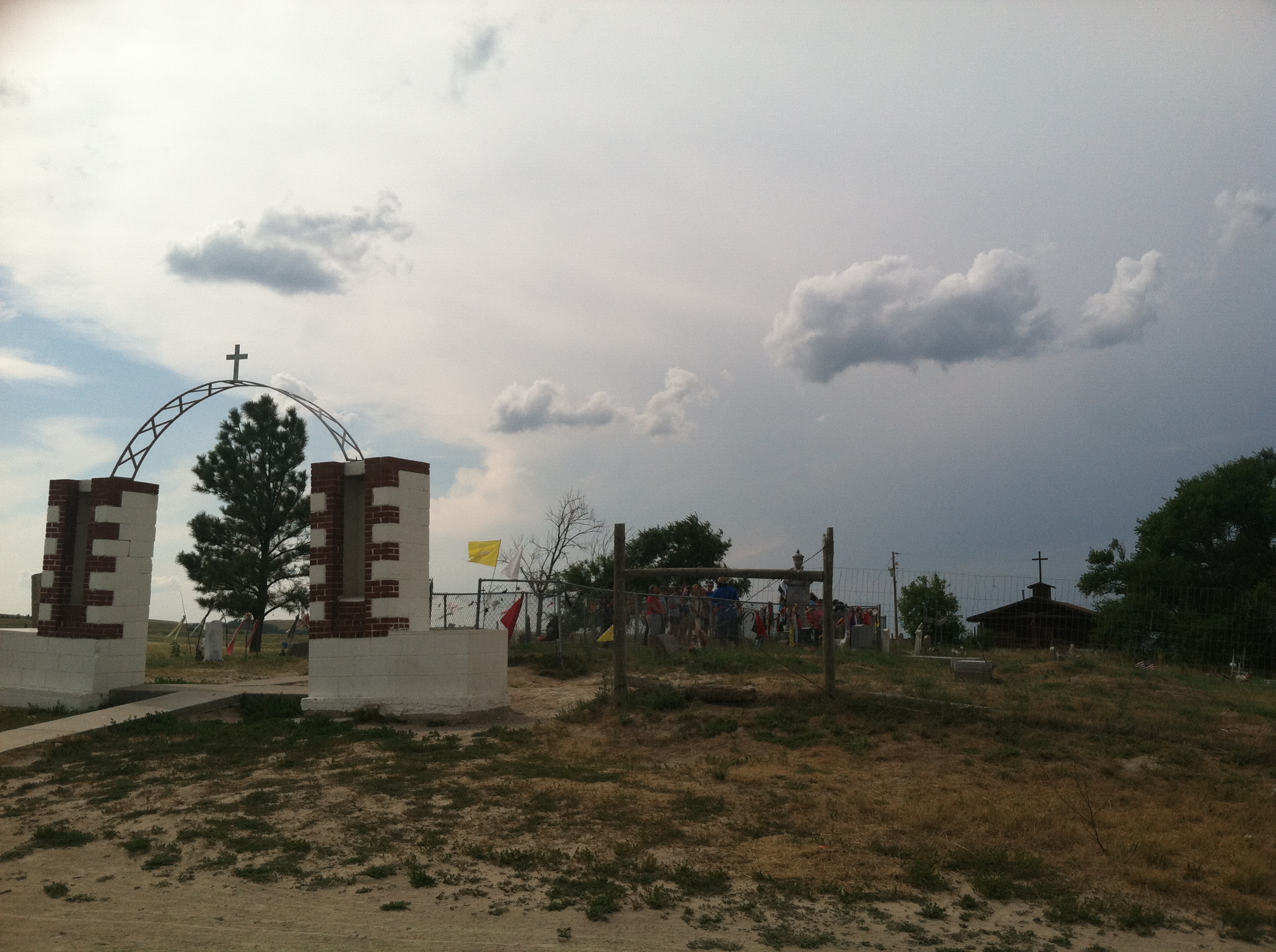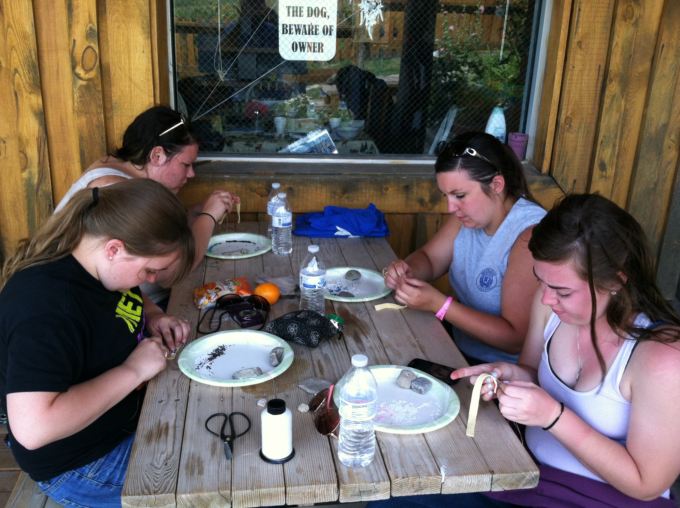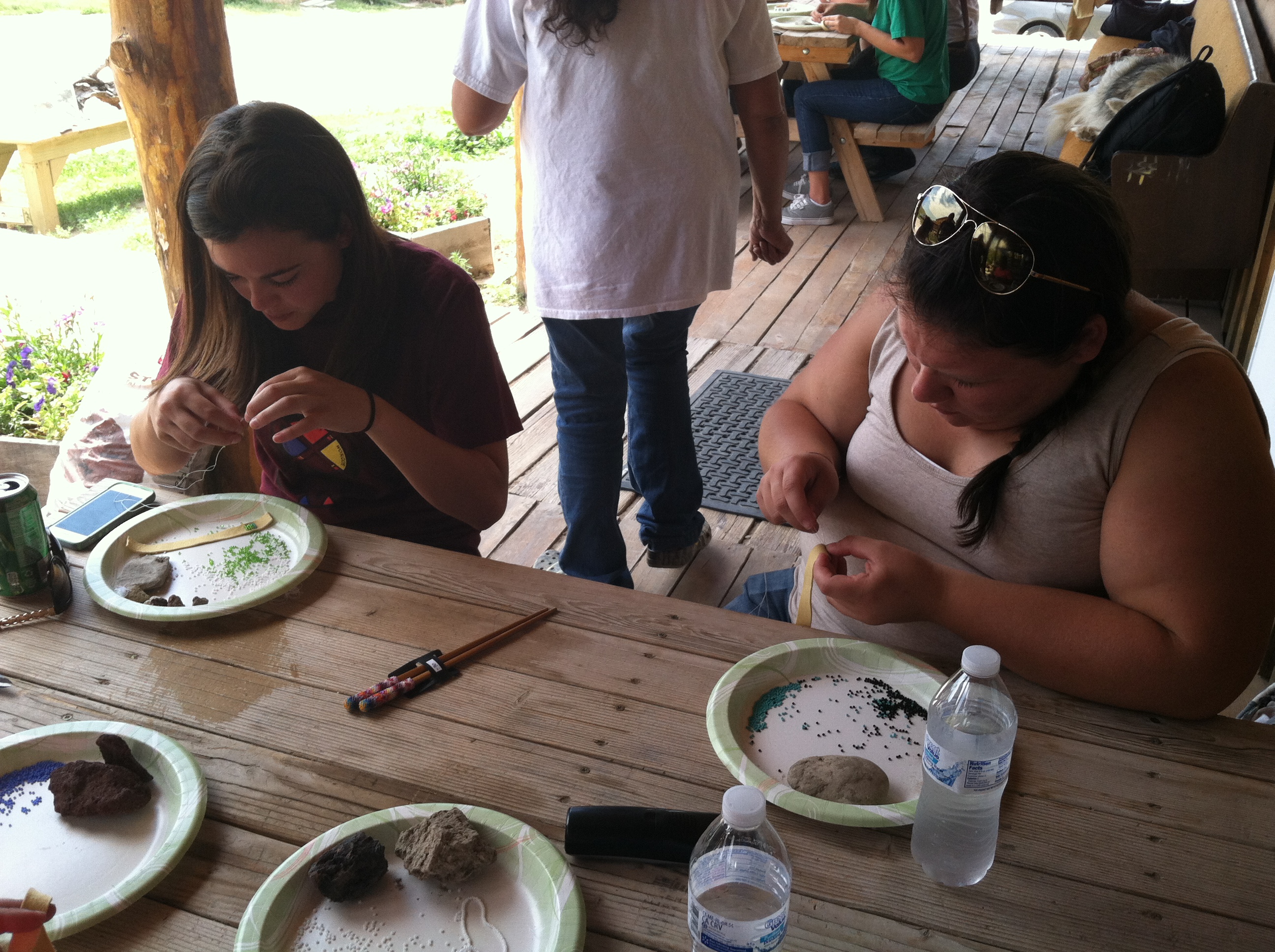 Between shuttling riders to Tyler’s house, the other groups received a beading lesson from Verola Spider, Verola’s daughter, Angel, and another friend Alyssa. Rosie’s is such a calm and relaxing environment–couple that with a beading lesson, and you have a very zen afternoon. I have a student on the trip who is originally from Uruguay, and she is quite the entertaining talker. During beading, she was quiet for the first time of the trip. Many of the students were able to finish their bracelets and now have a much better understanding of the amount of time and attention to detail that goes into Lakota artwork. We had amazing teachers and our conversations with them were certainly the high point. Verola is an amazing person with a calm spirit. She has a very large family (10 children) and many, many grandchildren. In the fall she will begin working as a teacher at the Head Start in Manderson. Her daughter Angel plans to return to college to earn her Masters degree in counseling at Lewis and Clark University in Portland, Oregon. Angel shared with us part of her pow wow regalia which included some of the most beautiful beading that I have ever seen. Our third teacher was a girl who will be entering 12th grade in the fall. She is the same age as my son, but her life is so much different. She lives with her grandmother and has experienced the difficulties of having a family member with a substance abuse problem. She is a bright and beautiful girl who plans to attend college for social work. She was a pleasure to talk to, and one of our students really made a connection with her. She gave us her contact information, and many of the group plan to stay in touch to offer her encouragement. As we were preparing to leave, Rosie asked if we could provide any assistance to Alyssa’s family as they were about to have their electricity turned off. We gave Alyssa all of what was left of our donated money–not quite enough for the bill, but hopefully will help. She was very giving to us–sharing information on traditions, her daily life on Pine Ridge, her hopes and dreams–how could we not try to give a little in return? We always take more, unfortunately.