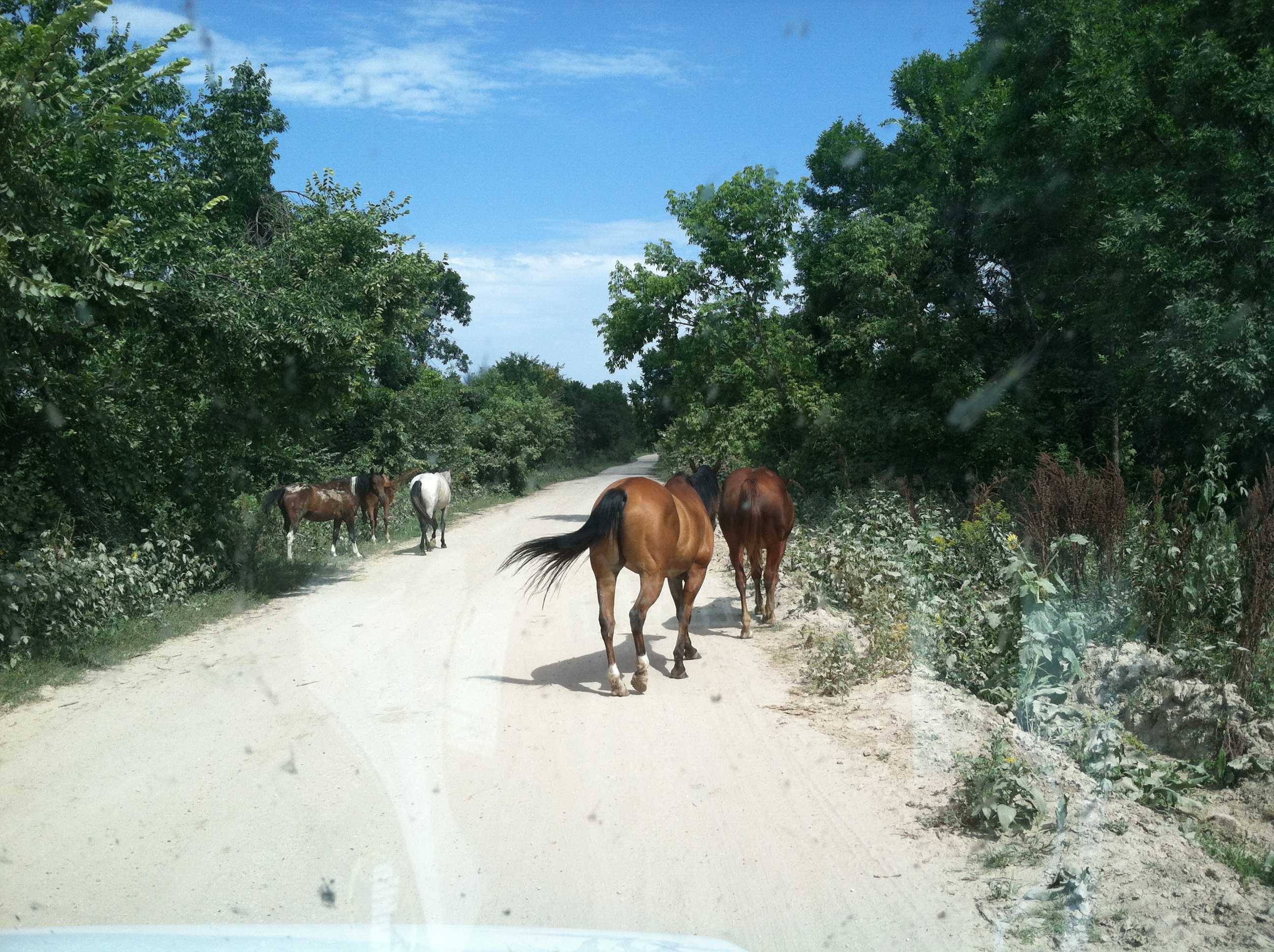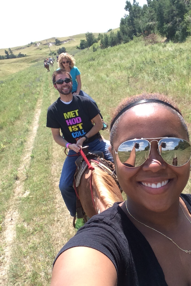 How can you replicate the success of yesterday? Not sure that it is possible, but we gave it a go. Our day started with horseback riding at 8:30am for part of the group. We divided the group into 3 smaller ones and rode at Rosie’s (Singing Horse Trading Post) and Tyler and Denise’s house, a Native American family that Rosie knows. We had quite a few first time riders, but everyone bravely took on this activity. We took some supplies to Tyler and Denise, including backpacks and school supplies for their kids. The kids were so happy to get new backpacks that they hugged them! We have ridden their horses for a few years in a row now, and we get nothing but kindness and patience, even on the trips when students were so nervous that they cried. Tyler’s horse, Bullseye, just won the Indian Relays–I rode him a couple of years ago, and he was just beautiful and calm and patient. The first two photos are one of the groups riding at Tyler’s. The bottom photo is of a group of horses in the road (a little used dirt road close to Tyler’s house).