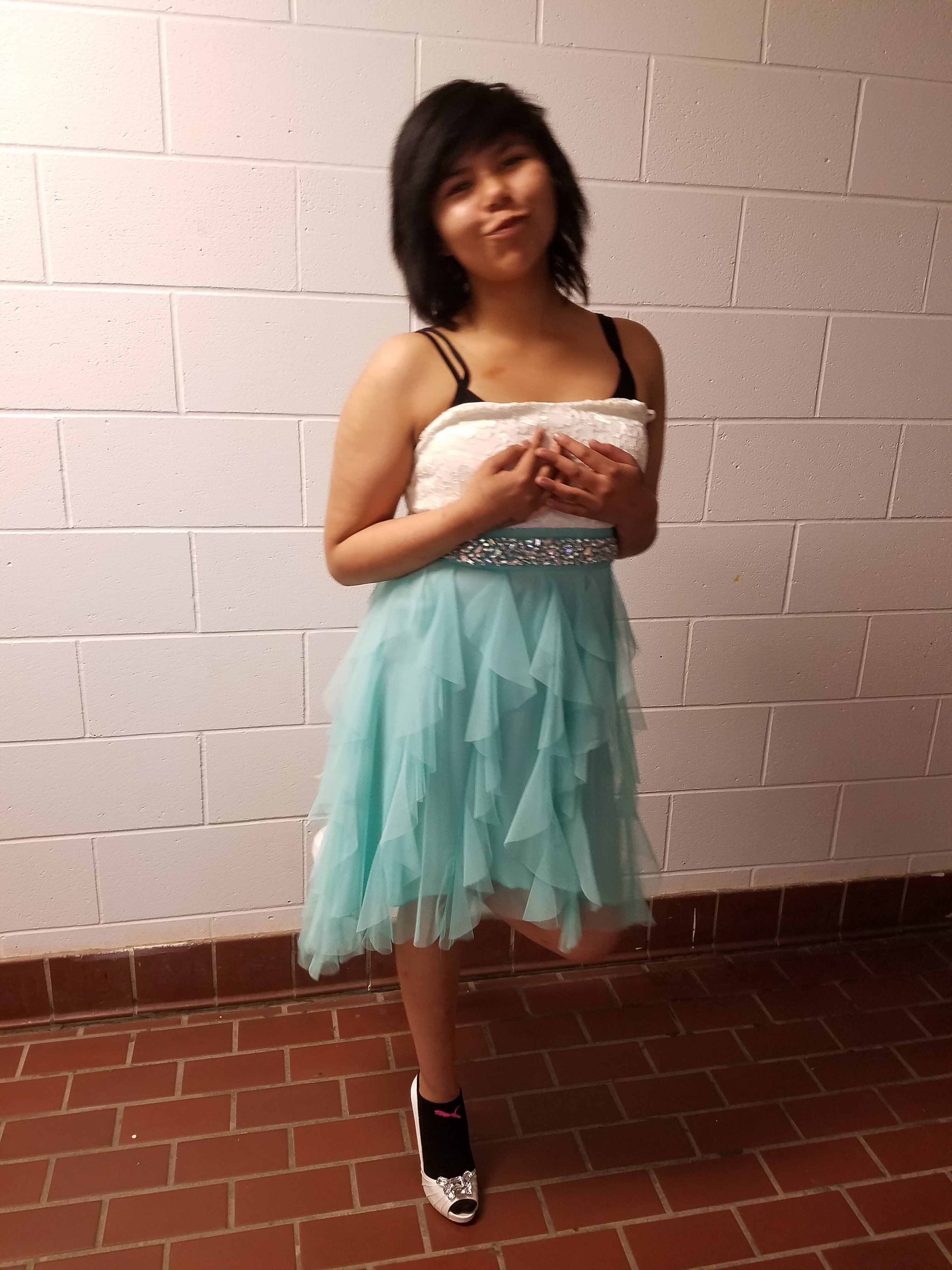 Happy Girl in Teal and white dress