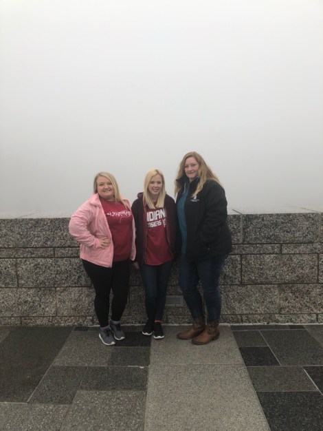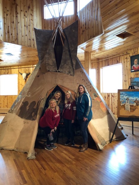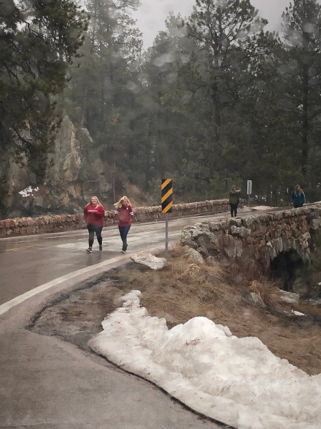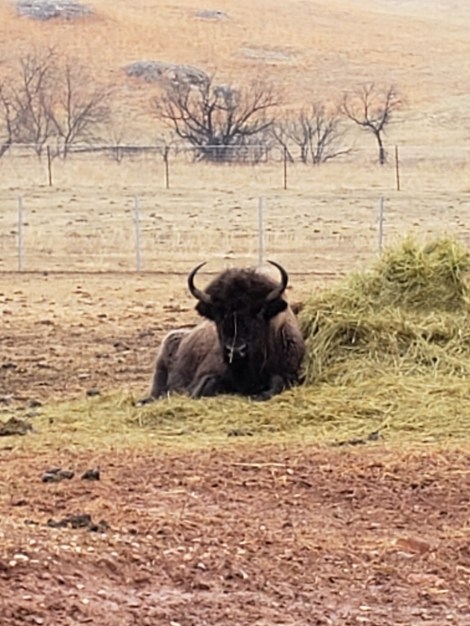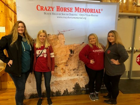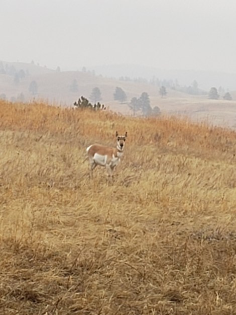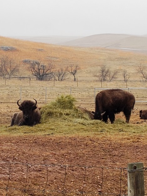 With the sun out today and temperatures around 65, we took the opportunity to go to Badlands National Park (in Interior, not the Red Shirt Table overlook). After a wrong turn on my part, an extra 30 minutes of driving, and a dire need for the bathroom, we made it to the park. We drove all around and stopped to look at several of the overlooks. There were lots of mule deer to see and some other unanticipated wildlife to view. Specifically, as we were driving by a tree (and not slowly), Laura exclaims, “I think I saw a porcupine in that tree!”. I hit the brakes backed up, and sure enough, there was a lone porcupine trying to take a nap in the tree. We all got out to look at him/her; he/she finally had had enough of our excitement and turned over on the branch and went back to sleep. Our final fun in the Badlands was a group photo shoot in the middle of the road with me as the photographer. (There were only like 5 cars in the park at this time of the year so completely safe).