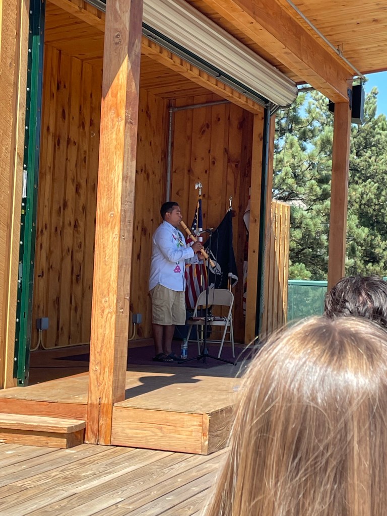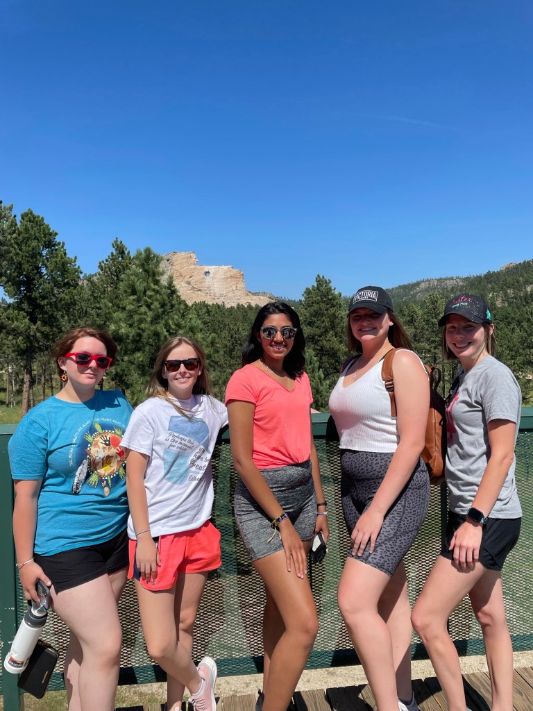 Tuesday found us driving back toward Rapid City but this time for some sightseeing and cultural activities.  We went to Custer and were able to drive the loop and catch the burros just before the end of the loop.  I love the burros!  We came prepared with the healthy burro snack of carrots (instead of a past year’s unhealthy burro snack of Cheez-Its).  There were new precious baby burros that added to the excitement.  The park was especially crowded—it seems that everybody is at Sturgis this year.  After Custer, it was on to the Crazy Horse Memorial.  The memorial has daily presentations that I thought were only pow wow dancers.  I was anxious to get the students to a presentation since it would be their only opportunity to see regalia and dancing in person.  After hurrying to Crazy Horse, we arrived to find that the presentation was a flute player instead.  No disappointment though (not allowed)—the flute player was outstanding, and we were able to hear ‘Amazing Grace’ played on this special instrument.  Crazy Horse was even more packed than Custer so we did not stay long.  After depriving the students of a real lunch with my hurrying to Crazy Horse, we had a nice, sit-down dinner at the Colonial House in Rapid City.  That certainly did the trick to end the day.