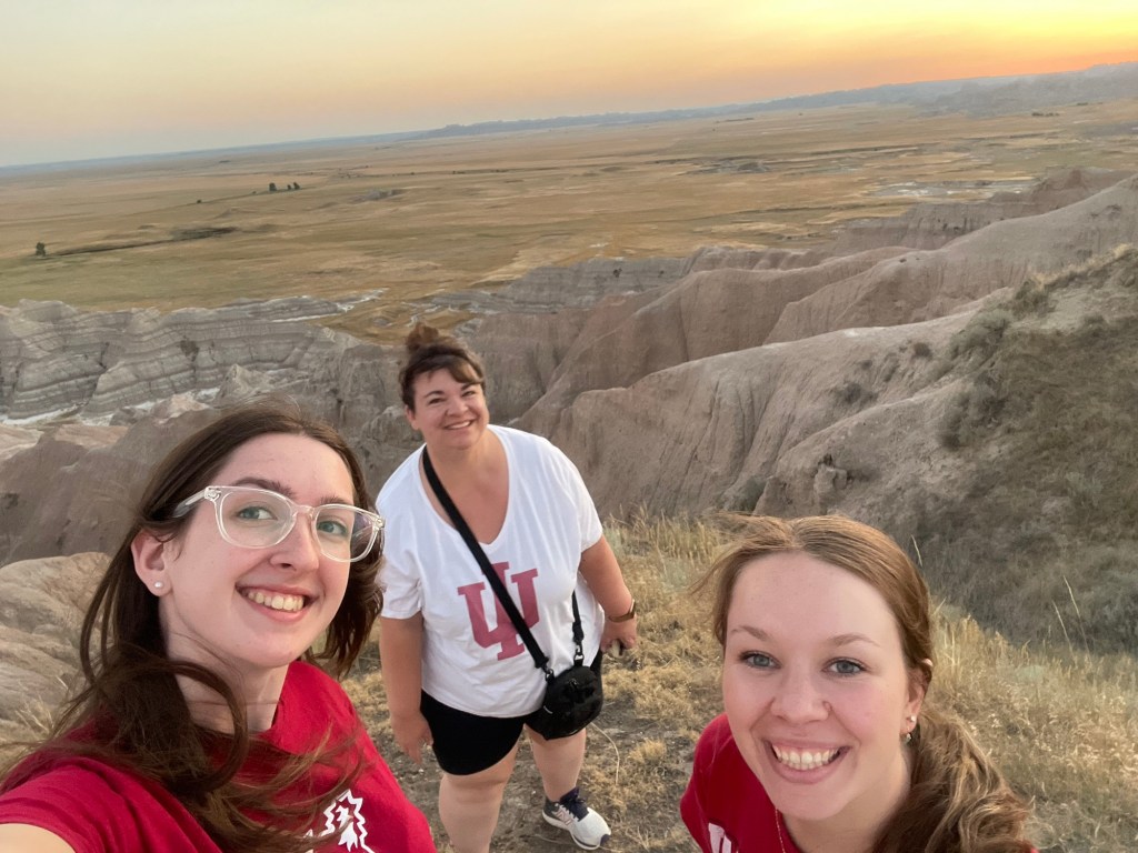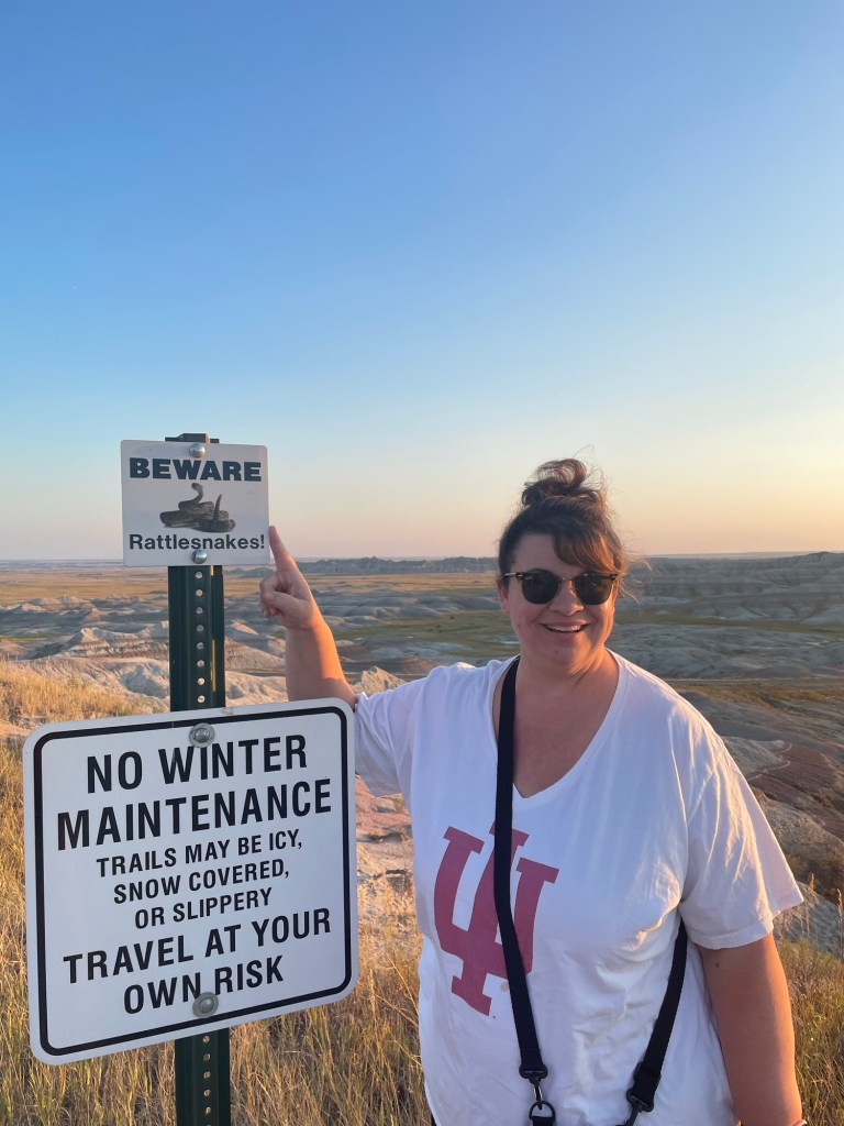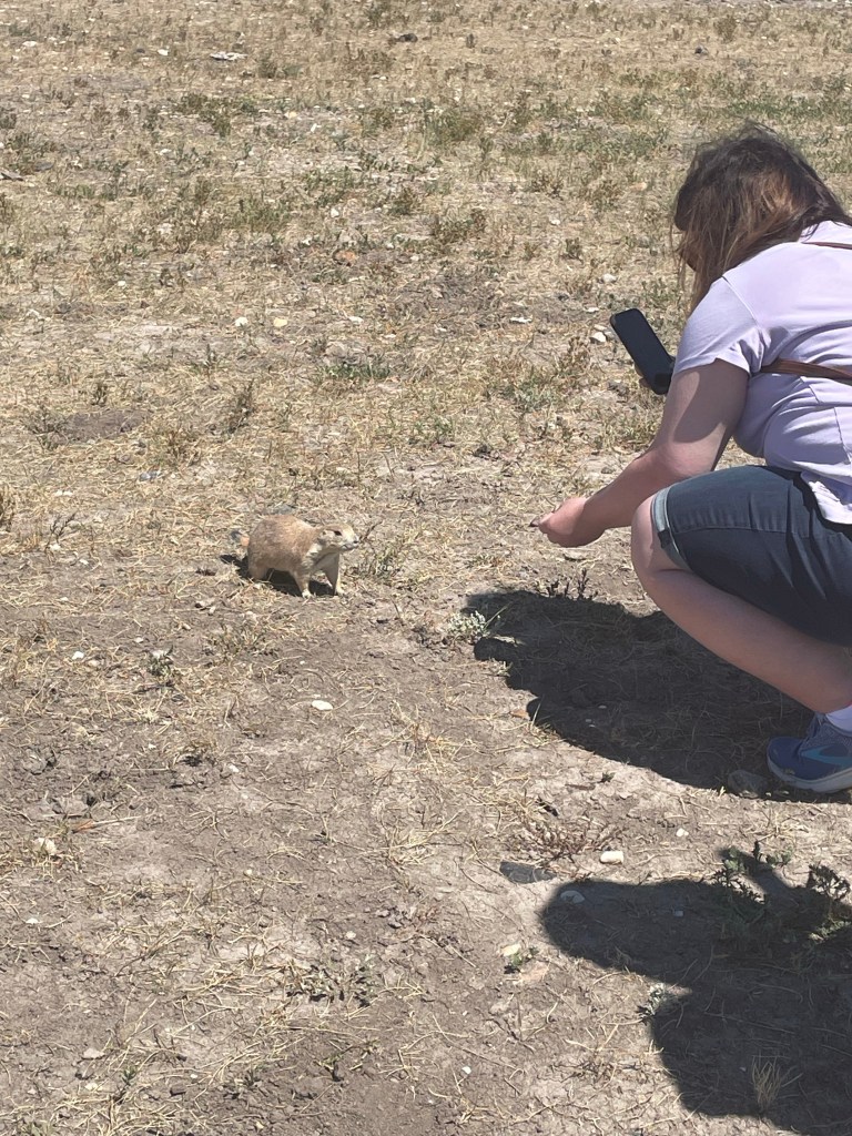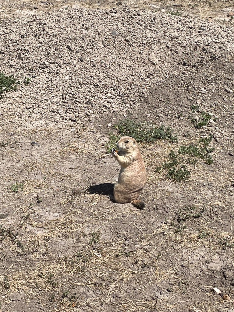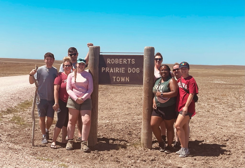 The first few days of the trip is always busy, busy, busy—trying to get organized, making contact with friends on the reservation, and getting to our health promotion sites in a timely manner. As soon as the pow wow and related events are over, our schedule lightens considerably, and everyone can take a deep breath and recharge. Monday brought us to a day of no planned health promotion so it was the perfect day to venture into Badlands National Park. The park is super busy with vacationers and motorcyclists up for Sturgis. We meandered through the park stopping for photos frequently. The students were able to see buffalo from a distance, a big horn sheep, and of course, the prairie dogs. We stopped at Robert’s Prairie Dog Town in the park for viewing a bit more up close. After realizing that we were only 10 miles from Wall at this point. We ventured into the town so the students could experience Wall Drug in all of its tourist-trap glory. It was a bit too much of a crowd for me with again MANY motorcycles and vacationers, so we didn’t stay too long.