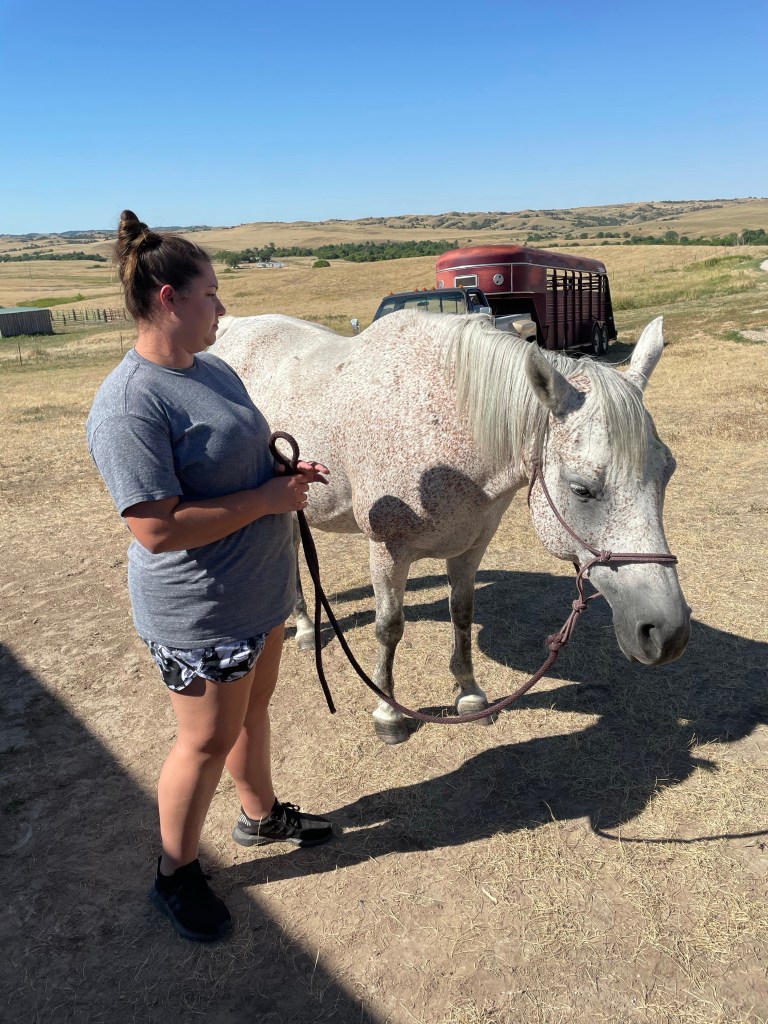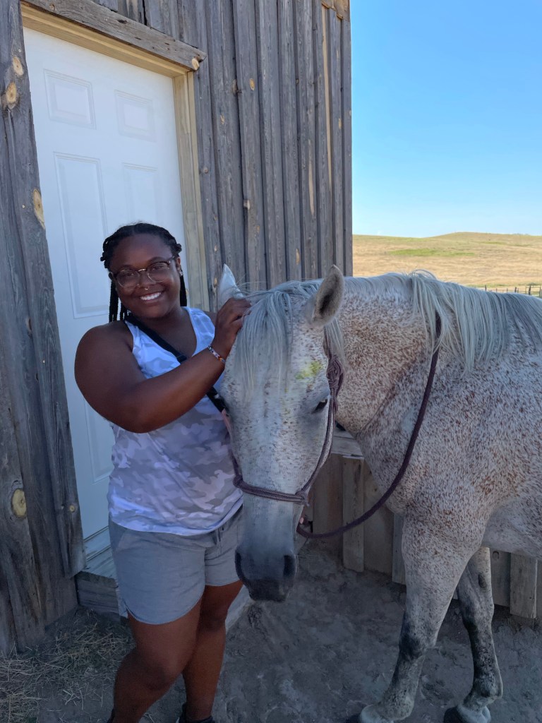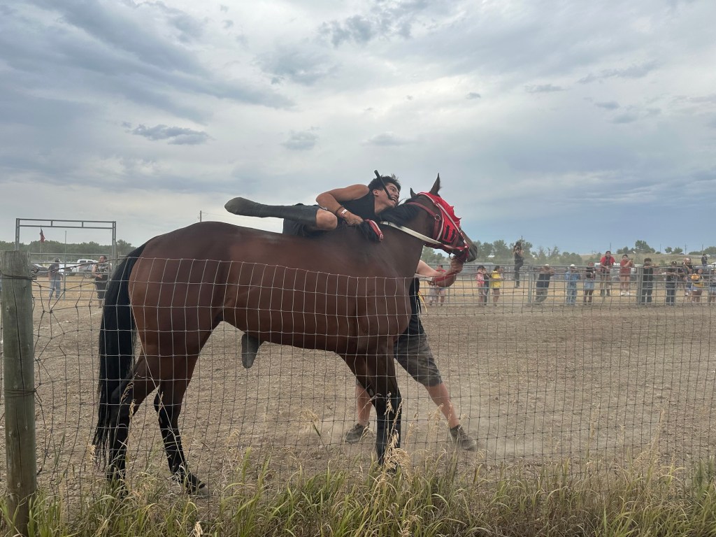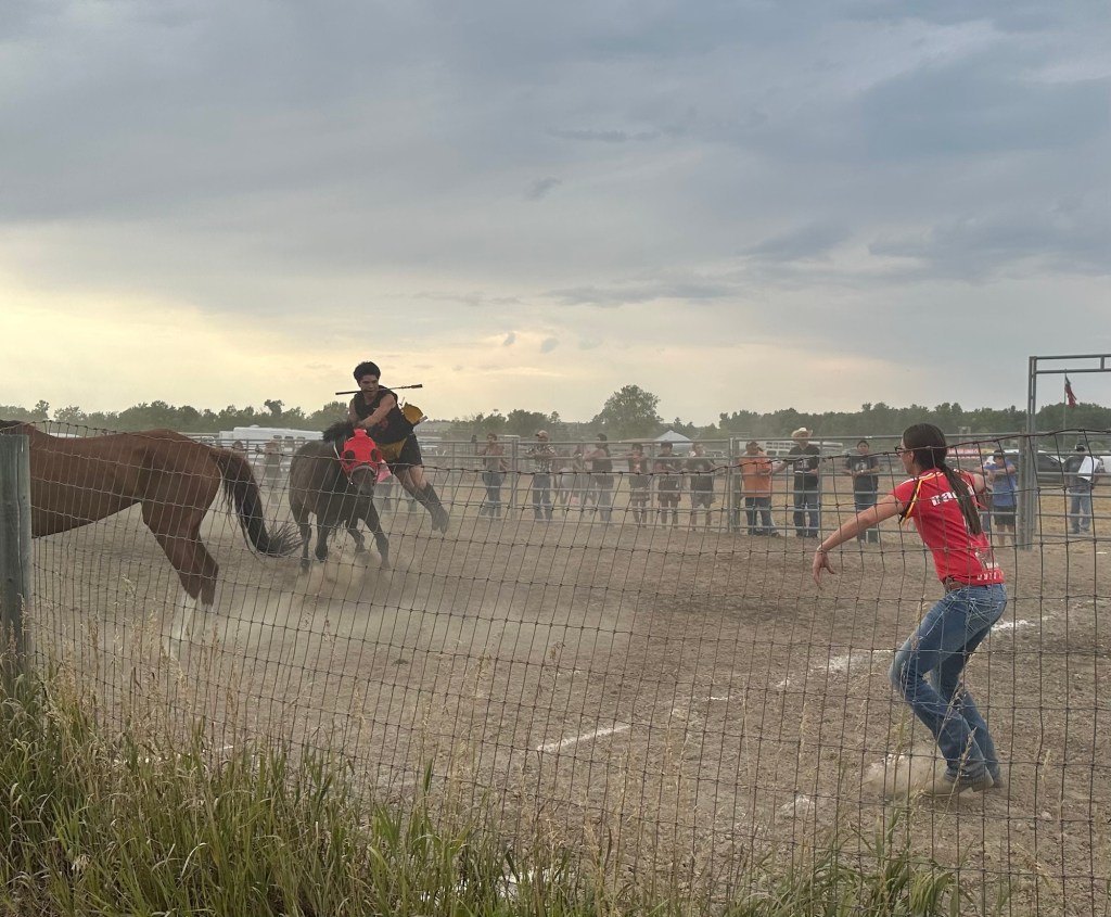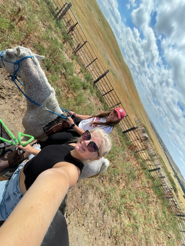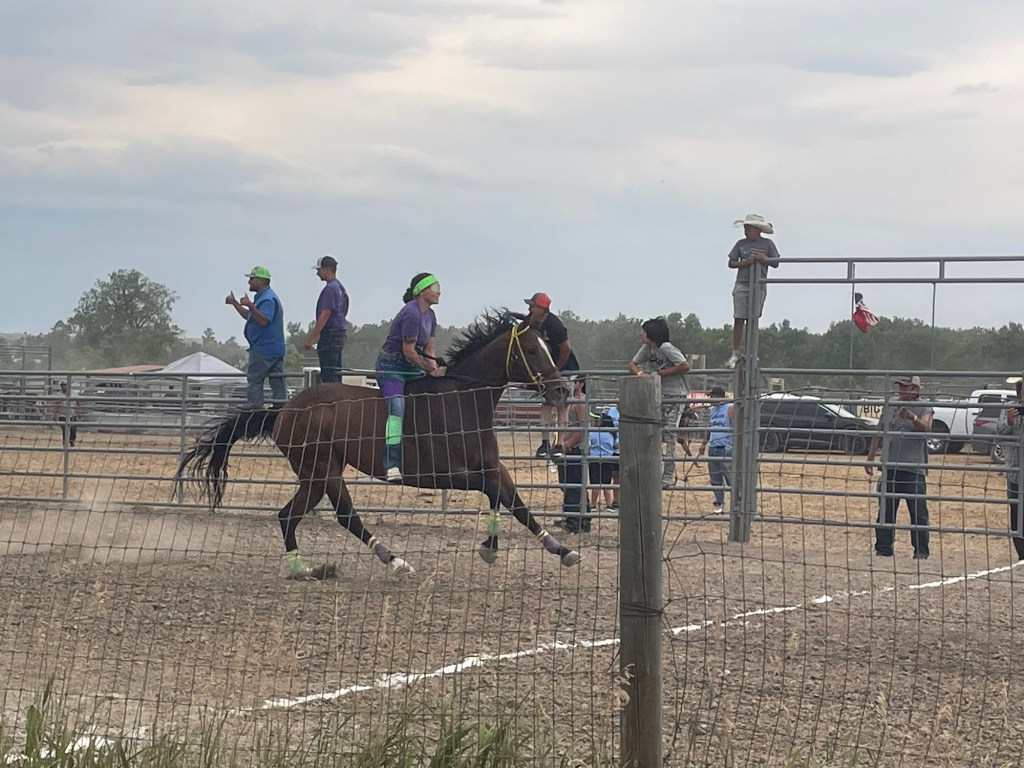The group divided up with 4 starting their beading lesson and 4 going with Rosie to round up horses. After about an hour, to my surprise, all 4 students arrived riding bareback—a first for any group! All I can say is wow! Rae rode Peppa (Suzie’s favorite horse); Chase rode Little Big Horse (a mustang); Madison rode Goldie (who had a baby on January 1); and Aurora rode Coon Tail (one of my favorites!). They all looked like experts riding in from the hills of Rosie’s property! After very long goodbyes, the beading group switched to take their turn. Beading was a bit slower this time with not many in the group having the patience for this art form (especially in the 100 degree heat!). After the others rode, we completed screenings on anyone interested at the trading post.