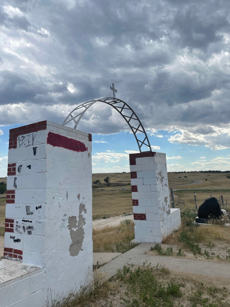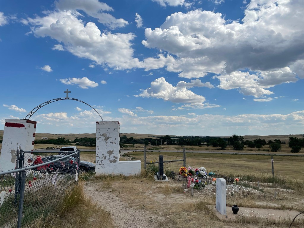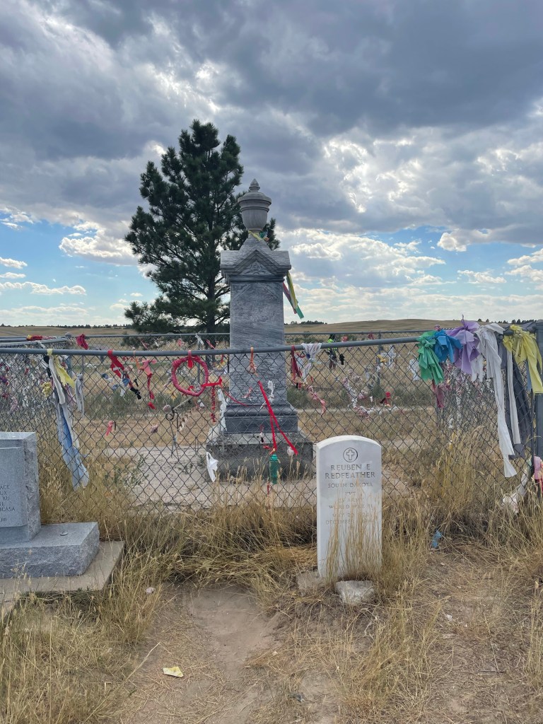 After the visit with Mrs. G, we had a spur of the moment, delicious lunch at the burrito stand across from the school (and why not, since the students essentially didn’t get lunch yesterday because I forgot the peanut butter! Big oops!). The OLC Historical Center is still closed but we stopped by the new art space that opened in Kyle by the Chamber of Commerce and were able to get a quick tour and hear about the very neat program that has begun there. Our final stop for the trip was the Wounded Knee Massacre site. The cemetery was quiet with no other people present beyond an older couple from Minnesota. We spent some time in somber reflection there, and as usual, I felt the restless energy that seems to always be present.