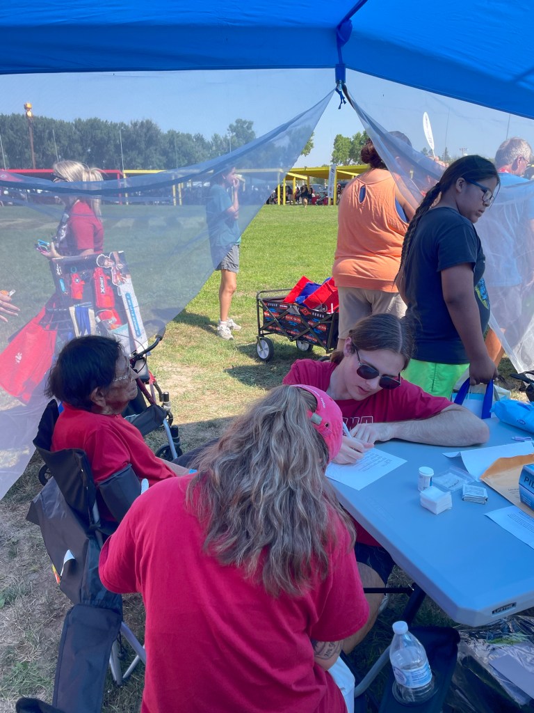 Loaded up with health promotion supplies, donations, and students, we arrived for the health fair by 8:15. We were able to pick a spot for our booth under the pow wow arbor and worked on getting organized for a 10am start. The students are doing great with working as a team to get things done. I tend to bark out orders and directions during the trip, and I am trying very hard not to do this. They can problem solve, and I just need to let them!