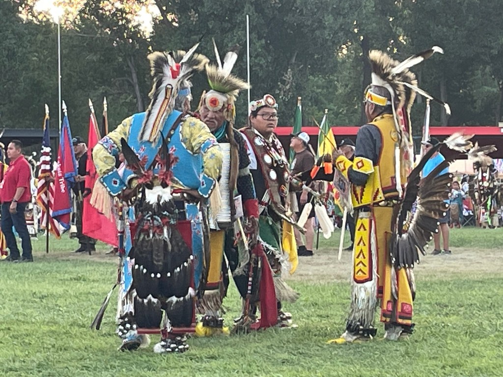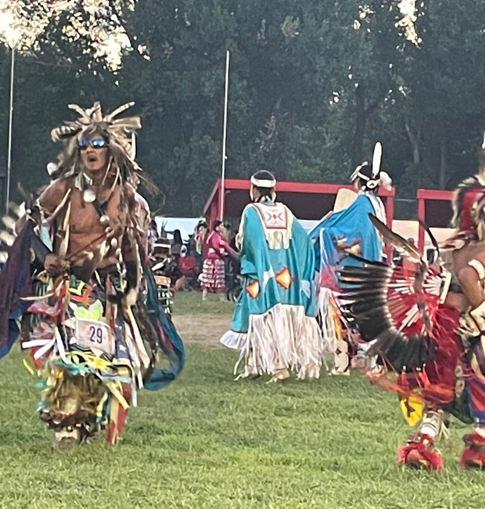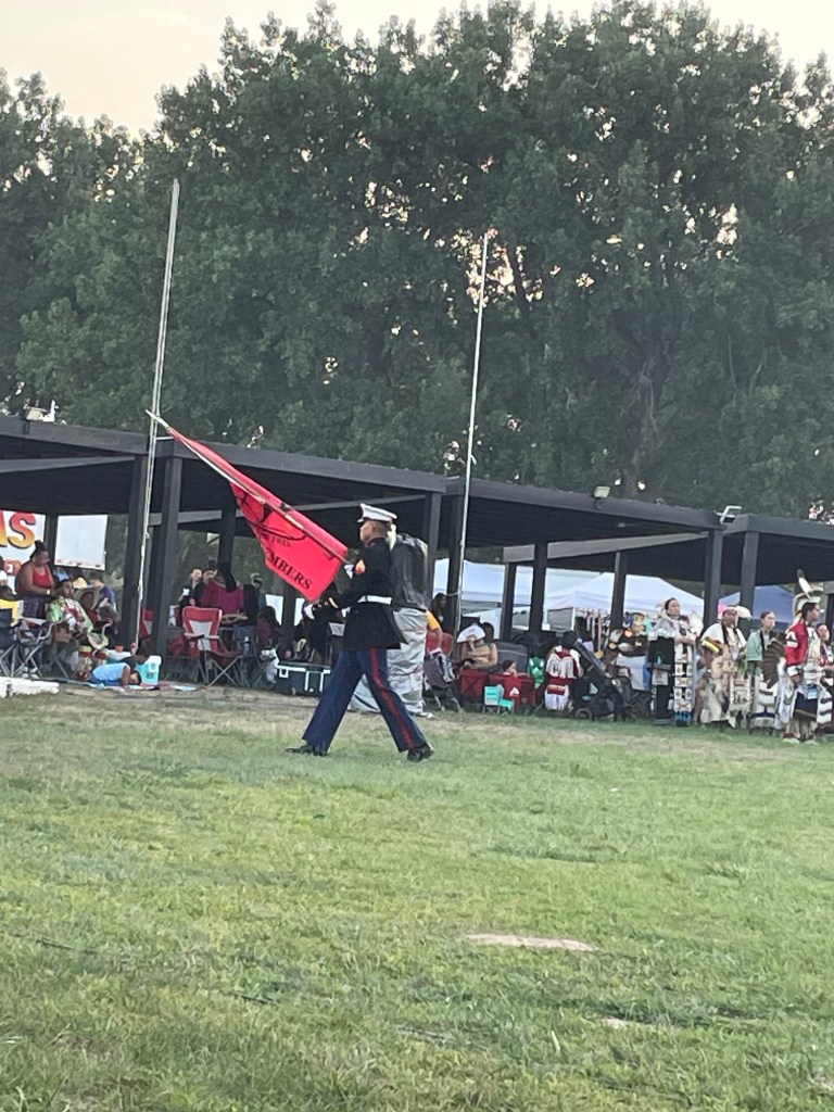 We got to the pow wow grounds early to get a good seat, and lucky for us, we were able to get a front row spot. The Grand Entry is always the best—the veterans and elders in their regalia are so special to see. Also, I have had the opportunity of seeing the same dancers over the years, and there are quite a few favorites. While the students were in the front row, I sat one row back behind a family with two dancers—a mother in her beautiful turquoise jingle dress and a teenage boy in striking pink regalia for the chicken dance. I loved watching the mom help him get into his very elaborate regalia for the grand entry and was really looking forward to seeing him dance. It is also important to note that it continues to be 100+ degrees, and the dancers are in full regalia, as well as some of the veterans in full military uniform. In the Veterans Group of flag bearers was the same Marine from last year. He is in full dress blues with white gloves on in the heat, standing as tall and proud as anyone I have ever seen. Seeing him reminds me of the sacrifice that the uniform represents.